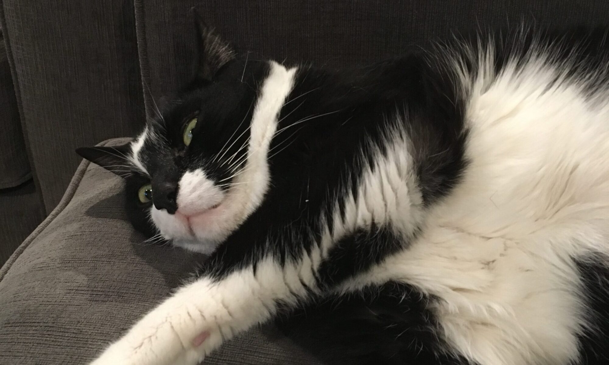 This is Dave. He is a 15 year old Tuxedo whose hobbies include sleeping, begging for treats, cuddling in 10-minute intervals, begging for treats again, and drinking water from any sink he has access to. As the oldest of 3 (adopted) siblings, he has no cares to give, and will do what he wants, when he wants.