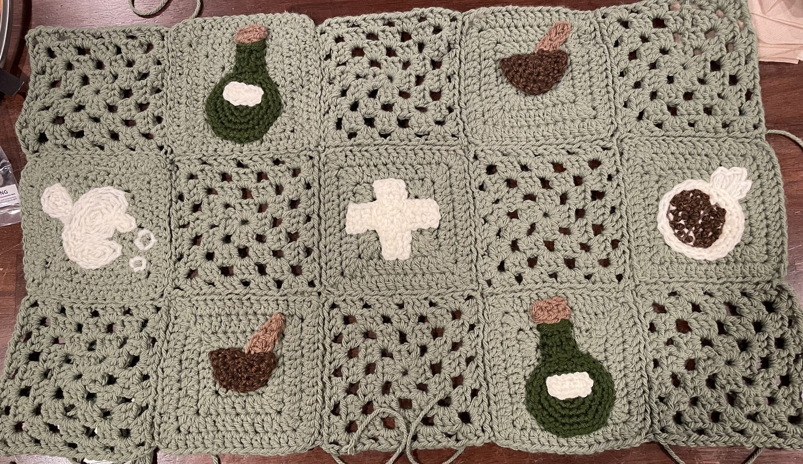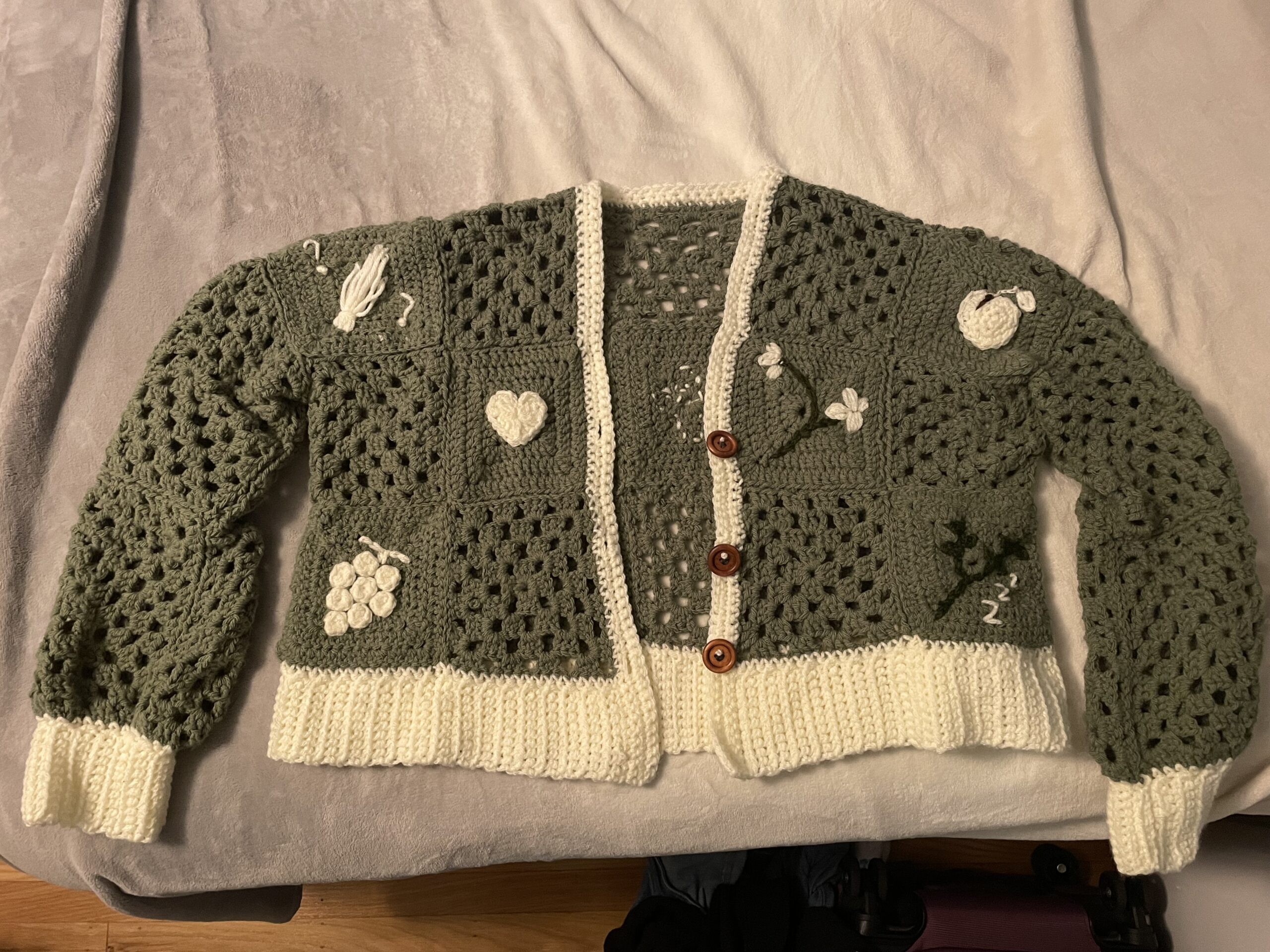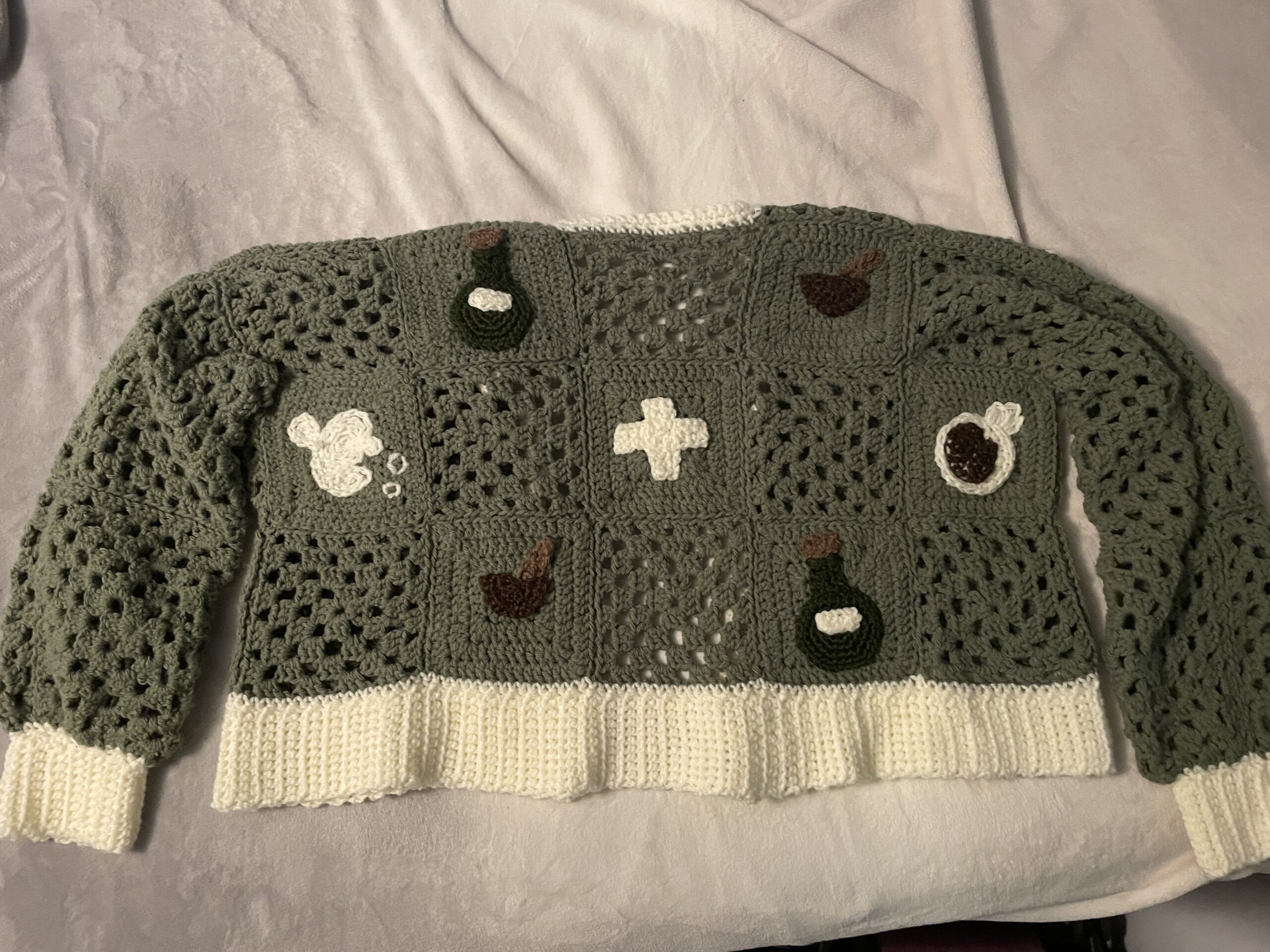 10-16-2022 || 2nd ever cardigan! This one is inspired by the character Alfyn Greengrass from the game Octopath Traveler. Since he's an apothecary, each granny square is based on various consumable items that can be used during battle.