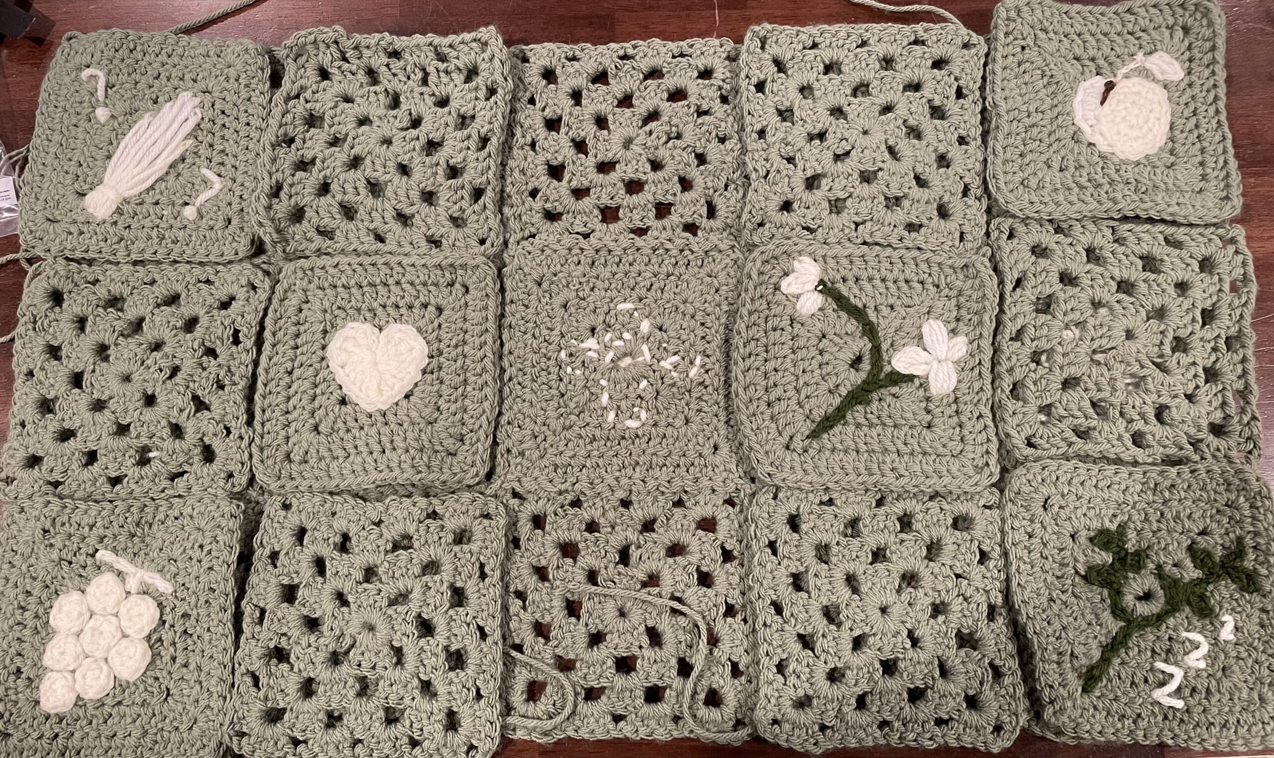 9-30-2022 || An in-progress shot of the granny squares for my Alfyn Greengrass cardigan being sewn together