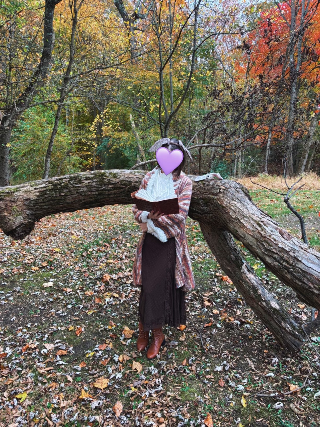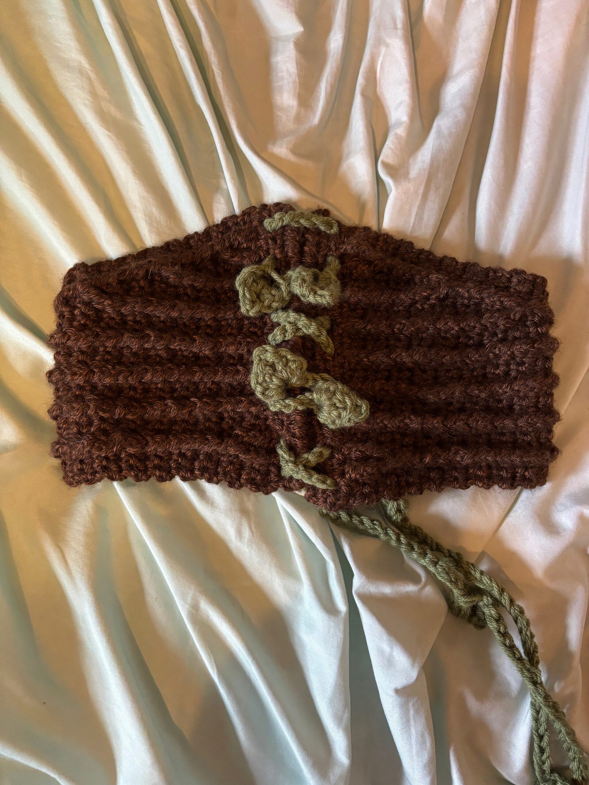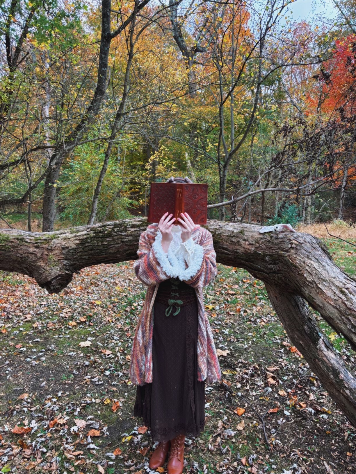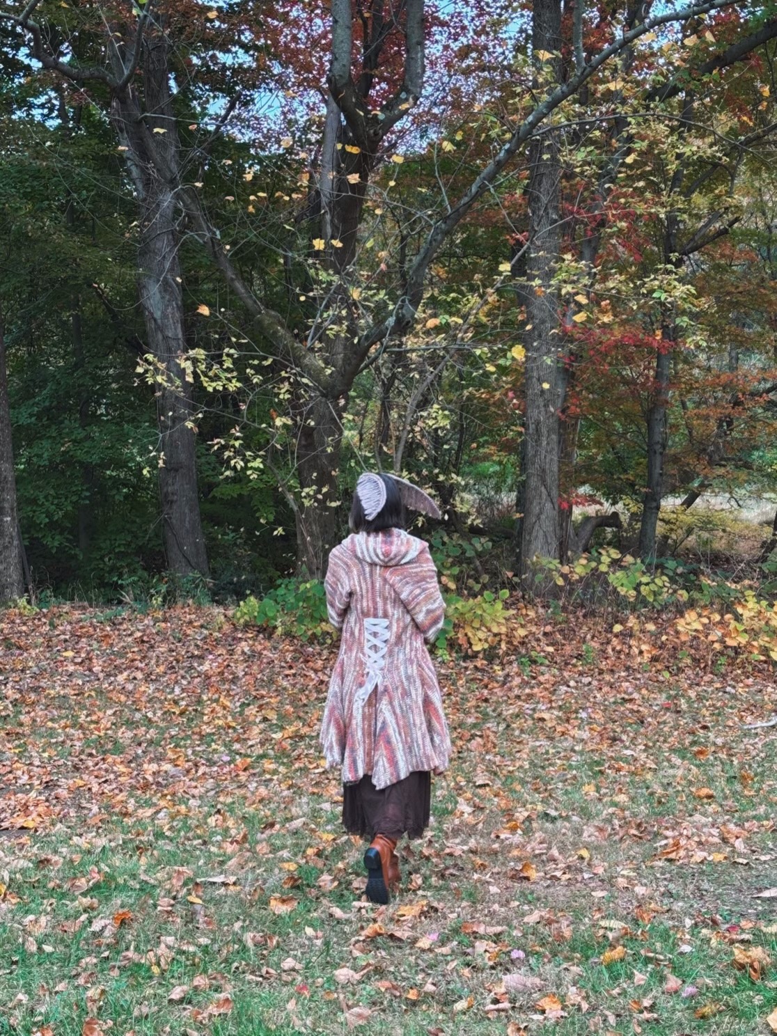 10-14-25 || For Halloween this year, I decided to be a moth! This costume features my first major Tunisian crochet project (Priestess Coat by Morale Fiber), as well as a bark-inspired corset (WhimsiRow) and freehanded moth antennae.